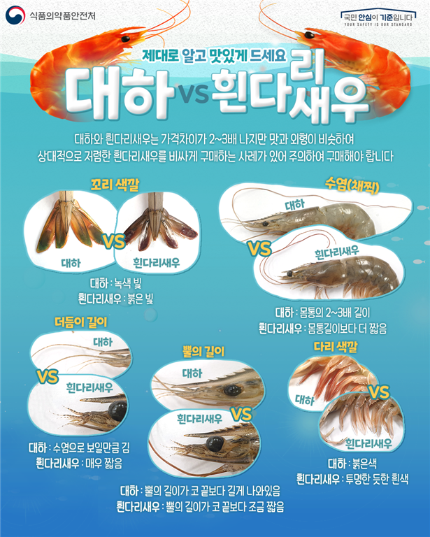 [푸드투데이 = 황인선기자] 식품의약품안전처(처장 김강립)가 31일 가을철 별미로 인기가 많은 새우를 구입할 때 ‘자연산 대하’와 ‘양식 흰다리새우’를 정확하게 구별할 수 있는 방법을 안내했다.