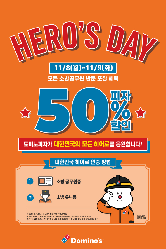 도미노피자는 다가오는 소방의 날(11월 9일)을 맞아 대한민국 모든 소방 공무원을 대상으로 ‘히어로즈 데이’를 실시한다.