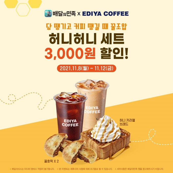 이번 할인 프로모션은 배달의민족 앱을 통해 ‘허니허니 세트’ 주문 시 3,000원을 자동 할인 받을 수 있다. ‘허니허니 세트’는 ▲음료 2잔(아메리카노 or 카페라떼) ▲허니 카라멜 브레드 ▲꿀호떡 2개로 구성되어 있다.