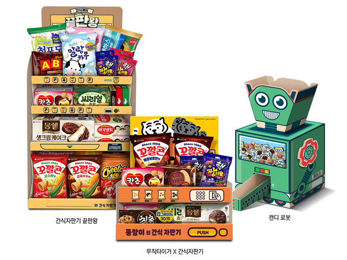 ‘간식자판기 끝판왕’은 사무실 간식용으로 기획되어 몽쉘, 치토스 등 34개의 제품이 들어가 있다. 기존 ‘간식자판기’는 상단과 하단 2층 구조 였다면, ‘간식자판기 끝판왕’은 4층 구조로 높게 만들어 더 많은 제품으로 구성, 제품 진열이 한 눈에 들어올 수 있게 했다. ‘캔디 로봇’은 아이와 학부모를 대상으로 만든 제품으로 청포도 캔디, 말랑카우 밀크 등 4종의 제품으로 구성된다.