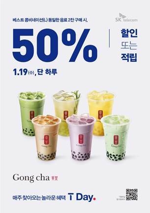 [푸드투데이 = 조성윤기자] 공차코리아가 새해를 맞아 19일 SKT T멤버십 고객을 대상으로 ‘공차 T Day’ 프로모션을 진행한다. 행사 당일 공차 매장에서 베스트 콤비네이션(L) 메뉴 6종(블랙 밀크티+펄, 타로 밀크티+펄, 피스타치오 밀크티+펄, 제주 그린 밀크티+펄, 청포도 그린티+알로에, 망고 요구르트+화이트펄) 중 동일한 음료 2잔을 구매한 T멤버십 회원이라면 할인 또는 포인트 적립 중 하나를 선택해 혜택을 받을 수 있다.