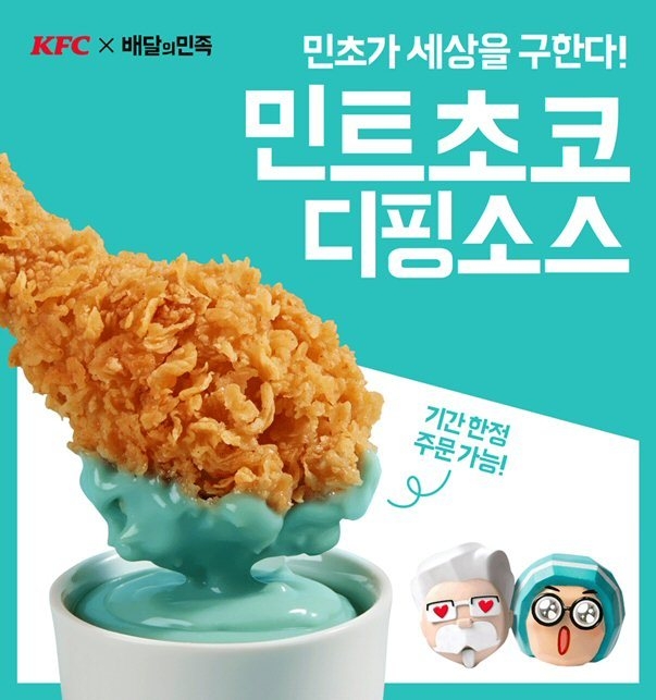 [푸드투데이 = 조성윤기자] KFC가 치맥과 삼계탕 등으로 치킨의 인기가 증가하는 여름을 맞아, 치킨을 색다르고 재미있게 즐길 수 있는 제품을 선보이고자, 배달의민족과의 콜라보레이션 제품 ‘민트초코 디핑소스’를 선보인다.