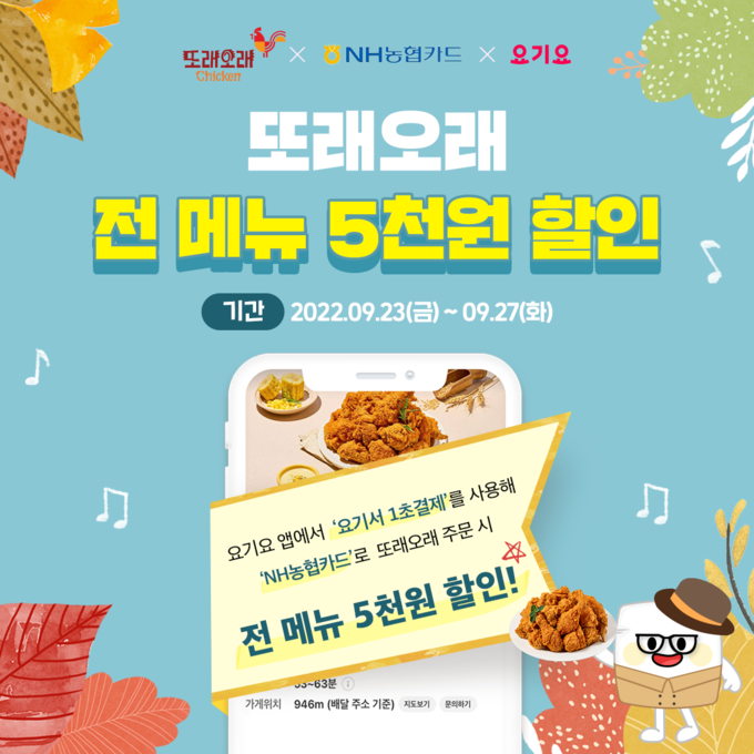 [푸드투데이 = 황인선기자] 농협(회장 이성희)목우촌의 치킨 프랜차이즈 또래오래는 오는 27일까지 배달 앱 요기요에서 NH농협카드 결제고객 대상 할인 이벤트를 진행한다고 23일 밝혔다.