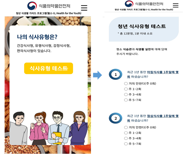 [푸드투데이 = 황인선기자] 식품의약품안전처(처장 오유경)는 식사 습관이 불규칙한 청년층의 건강한 식생활을 위해 자신의 식사유형을 손쉽게 알아보고, 그 유형에 따른 맞춤형 가이드를 제공하는 ‘청년 식생활 가이드 프로그램(헬스-U)’을 31일부터 식품안전나라에 공개한다고 밝혔다.
