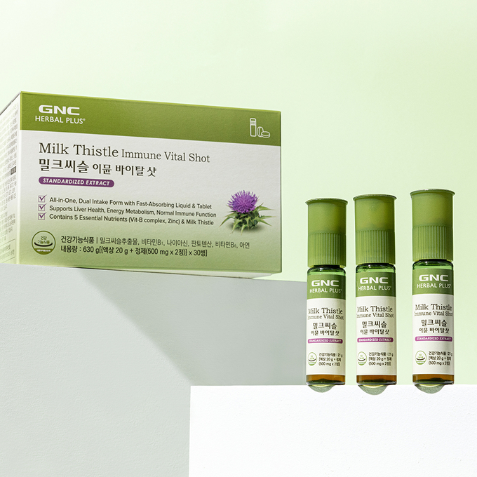 ‘GNC 밀크씨슬 이뮨 바이탈 샷’은 밀크씨슬추출물의 기능성 성분인 실리마린의 1일 최대 권장량인 130mg을 함유하고 있어 간 건강에 도움을 줄 수 있는 제품이다. 비타민B군, 아연 등 필수 영양성분 5종도 함유해 정상적인 면역 기능 유지와 에너지 생성에 도움을 줄 수 있다.