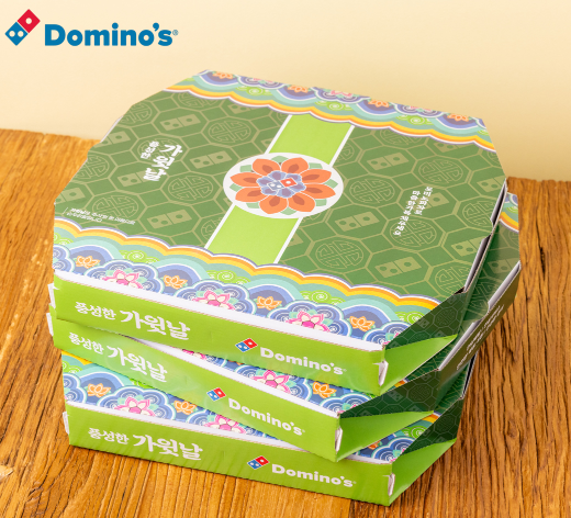 이번 한글날 도미노피자가 선보인 피자박스에는 추석을 일컫는 옛 우리말인 ‘가윗날’이라는 단어를 활용해 도미노피자를 찾아 주시는 모든 고객분들이 풍성한 추석을 보내시길 바라는 마음을 담았다. 이 외에도 한국 전통 문양을 피자박스에 새겨 한국적인 미를 더했다.