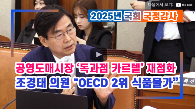 14일 서울 여의도 국회에서 열린 농림축산식품해양수산위원회(위원장 어기구) 국정감사에서 국민의힘 조경태 의원은 “지난 5년간 식료품 물가가 23%, 서민 생필품인 가공식품은 28%나 상승했는데, 정부는 기후변화나 국제 원자재 가격 등 외부 요인만 탓하고 있다”며 “OECD 평균 대비 식음료 물가지수가 147로 세계 2위 수준인데, 이는 구조적 문제이자 정부의 방임이 초래한 결과”라고 지적했다.
