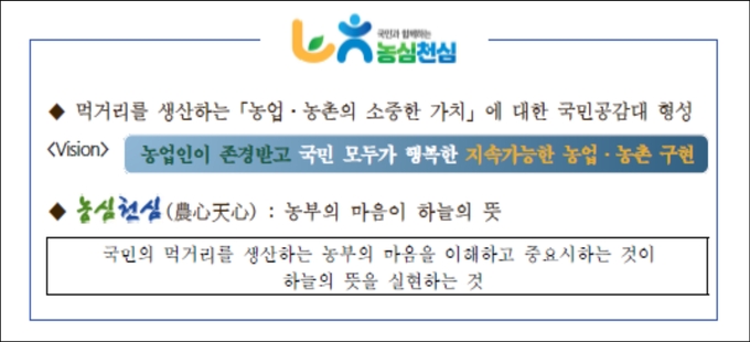 이번 농심천심운동은 농업인과 도시민, 정부·지자체와 함께 ▲ 농업·농촌 가치 확산 ▲ 농업소득 증대 ▲ 농촌 활력화를 통해 지속가능한 농업·농촌을 구현을 위한 범국민 실천운동이다.