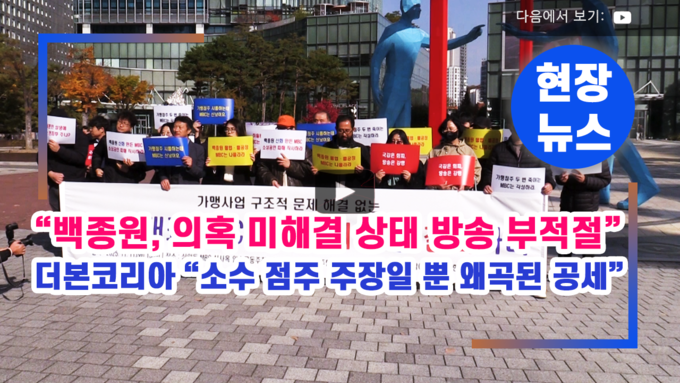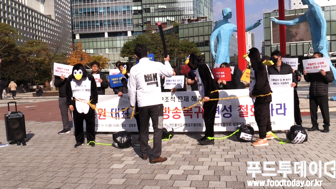 전국가맹점주협의회(이하 전가협), 연돈볼카츠가맹점주협의회, 대한가맹거래사협회, 참여연대 등은 11일 오후 서울 마포구 상암동 MBC 신사옥 앞에서 기자회견을 열고 “공정거래위원회 조사 등 각종 의혹이 해결되지 않은 상황에서 백종원 대표의 방송 복귀는 부적절하다”며 MBC 예능 프로그램 ‘남극의 셰프’ 편성 철회를 촉구했다.