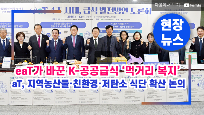 이번 토론회는 aT가 운영하는 공공급식통합플랫폼 ‘eaT’의 거래실적이 4조 원에 육박한 가운데 급식산업의 공공성·지속가능성·환경 대응 전략을 모색하기 위해 마련됐다. 현장에는 여야 의원과 산·학·관·연 관계자 등 120여 명이 참석해 뜨거운 관심을 보였다.