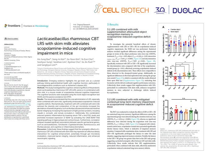 [푸드투데이 = 황인선기자] 쎌바이오텍은 강한 유산균 브랜드 ‘듀오락(DUOLAC)’의 주요 제품에 적용되는 특허 유산균 ‘CBT-LR5(KCTC 12202BP)’가 인지장애를 개선하는 작용 기전을 동물모델에서 최초로 규명했다고 27일 밝혔다.