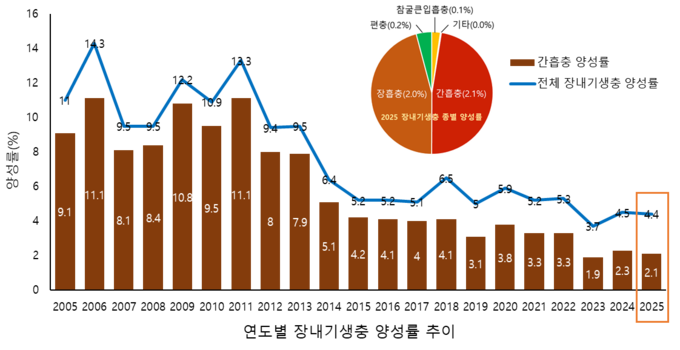 2025년 장내기생충 전체 양성률은 4.4%로 전년 대비 0.1%p 감소, 대표적인 기생충인 간흡충 감염률도 2.1%로 0.2%p 감소했다.