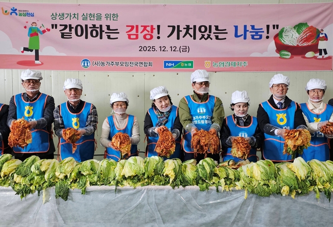 [푸드투데이 = 황인선기자] 농가주부모임전국연합회(회장 박민숙)와 농협경제지주(농업경제대표이사 박서홍)가 12일 전남 함평군 대동면에서 성평등 및 상생 가치 실현을 위해 3.5톤의 김장을 실시했다.