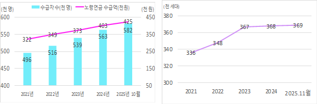 연금보험료 지원 사업은 1995년부터 시작되어 30년간 208만명의 농어업인에게 총 3조원을 지원했으며, 최근 5년 간 연금보험료 지원을 받은 농업인의 노령연금 수급자 수와 월평균 수급액은 지속적으로 증가하고, 지난 10월 기준 58만 2천명의 농업인이 노령연금 수급권을 취득해 425천원의 노령연금을 수급 받으며 안정적인 노후를 이어가고 있다고 농식품부는 설명했다.