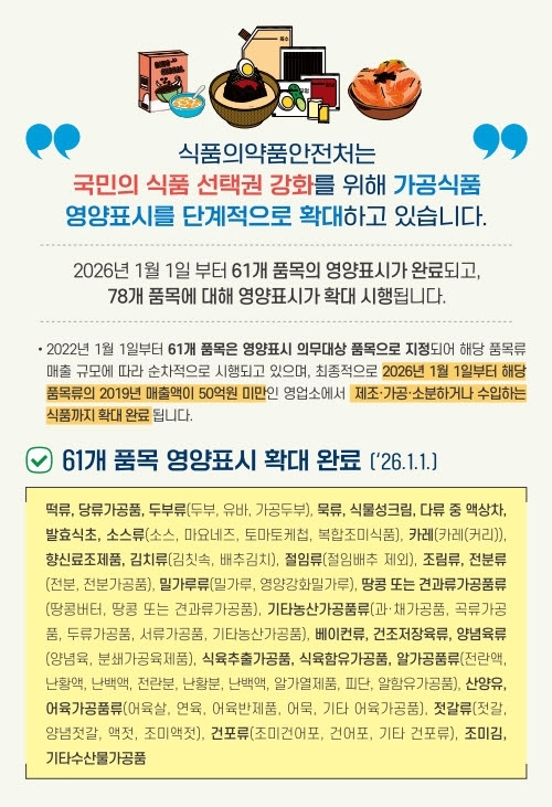 영양표시 제도는 식품에 들어있는 영양성분의 양과 비율을 정해진 기준에 따라 표시하는 제도로서, 지난 2018년부터 연매출액 규모에 따라 점진적으로 확대해 왔으며 올해 소규모 영세 업체를 포함하여 단계적 시행이 완료됐고, 버터류, 식육간편조리세트와 같은 특수 품목의 경우에는 2028년까지 적용 범위가 추가로 확대된다.