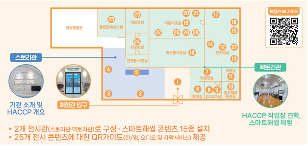 해썹 체험관은 전시 중심 ‘스토리관’과 현장 체험형 ‘팩토리관’으로 구성돼 있다. ‘스토리관’은 우리나라 식품 및 축산물 안전관리의 흐름을 한눈에 알 수 있는 공간으로 ▲해썹인증원의 역할 ▲해썹 및 스마트 해썹의 개요 등을 소개하고 있으며, ‘팩토리관’은 작업장 안전관리 방법을 배울 수 있는 공간으로 ▲위생·공정관리 기준▲ 사물인터넷(IoT) 기반 스마트센서 등을 직접 체험할 수 있다.