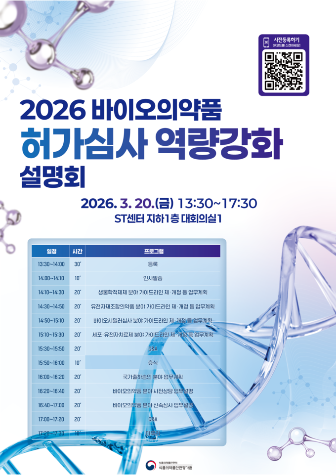 [푸드투데이 = 황인선기자] 식품의약품안전처(처장 오유경, 이하 식약처) 소속 식품의약품안전평가원(원장 강석연, 이하 평가원)은 바이오의약품 제조, 수입업체를 대상으로 국내 바이오의약품 산업의 경쟁력 제고와 심사 역량 강화를 위한 2026년 바이오의약품 허가·심사 설명회를 20일 서울 강남구 ST 센터에서 개최한다고 밝혔다.