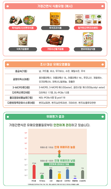 식품의약품안전처(처장 오유경)는 최근 수요가 급증한 밀키트, 샐러드, 즉석밥 등 가정간편식에 대해 중금속 등 유해오염물질 오염 수준을 조사하고, 국내 최초로 위해평가를 실시한 결과 제품 모두 안전한 수준이 확인됐다고 24일 밝혔다.