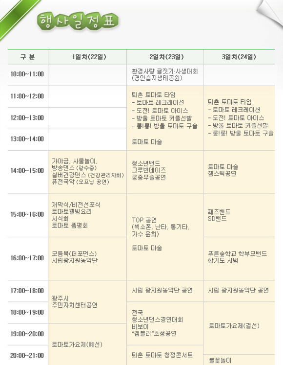 행사 첫날인 22일에는 가야금 연주와 건강댄스, 퓨전국악등이 개막식에 앞서 펼쳐지며, 식후행사로 광주시 주민자치센터 공연, 광주시립농악단 공연, 토마토가요제 예선 및 연예인 축하공연( 가수 주현미, 권인하, 소명 등)이 이어져 관객들의 시선을 사로잡을 예정이다.