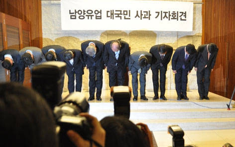 '밀어내식' 영업과 영업사원 폭언으로 논란을 일으킨 남양유업이 9일 서울 중구 브라운스톤에서 대국민 사과를 했다.