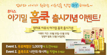 또한, 아기밀 홈쿡을 활용한 ‘나만의 레시피’를 올려주는 엄마들에게는 추첨을 통해 백화점 상품권 30만원권(1등 1명)과 10만원권(2등 5명), 아기밀 홈쿡 4종(3등 20명) 등 푸짐한 상품을 증정한다.