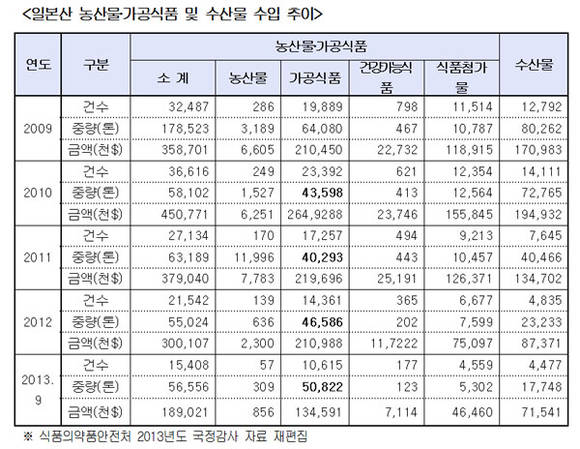 국회 보건복지위원회 소속 남윤인순 민주당의원이 21일 식품의약품안전처에서 국정감사 자료로 제출한 ‘일본산 농산물과 가공식품, 수산물 수입 추이’를 분석한 결과에 따르면, 농산물과 수산물의 경우 수입이 전반적으로 감소추세에 있는 반면, 가공식품의 경우 2011년 한 해만 잠시 주춤했을 뿐 증가추세를 보이고 있는 것으로 나타났다.