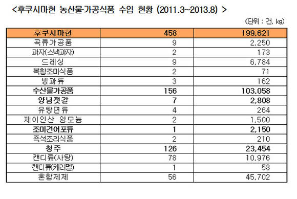 남 의원은“한국정부는 일본정부가 행한 출하제한 품목, 즉 13개현 26개 품목의 농산물과 8개현 50개 품목의 수산물에 대해 지난 2011년 3월25일 수입중단 조치를 하고, 금년 9월6일에는 일본 8개현의 모든 품목의 수산물에 대해 수입중단 조치를 하였지만, 이들 수산물을 주원료로 하는 수산물가공품에 대해서는 수입제한을 하지 않는 등 이중적인 행태를 보이고 있다”고 지적하고, “정부의 일본산 수입식품 안전관리대책의 허점 때문에, 후쿠시마 원전사고 이후 금년 8월까지 후쿠시마현에서 수입한 일본산 농산물과 가공식품 19만9,621kg 중에서 수산물가공품이 차지하는 비중이 무려 51.6%인 10만3,058kg에 달한 것으로 분석되었다”고 밝혔다.
