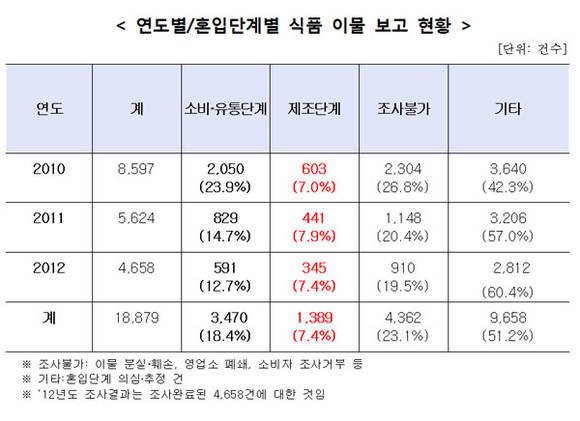 21일 국회 보건복지위 소속 문정림 새누리당 의원이 식품의약품안전처에서 제출받은 자료에 따르면, 이물보고(신고) 건수는 2010년 8,597건, 2011년 5,624건, 2012년 4,733건, 제조단계 행정조치 건수는 2010년 603건, 2011년 441건, 2012년 345건으로 감소했다.