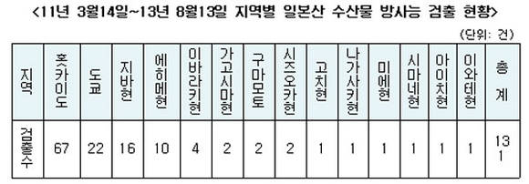 일본산 방사능 검출 수산물을 지역별로 살펴본 결과 훗카이도가 67건으로 가장 많았다. 이어 도쿄가 22건, 지바현 16건, 에히메현 10건 등의 순으로 많았다.