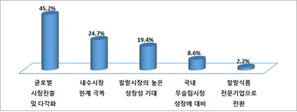 할랄시장에 진출하려는 이유는 ‘글로벌시장 진출 및 다각화’(45.2%), ‘내수시장 한계 극복’(24.7%)이 가장 높게 나타났으며 진출 시 예상되는 어려움으로는 ‘할랄시장에 대한 정보부족’(46.7%), ‘까다로운 인증 절차 및 비용’(37.7%), ‘할랄 공정 및 설비구축 비용부족’(29.3%) 등으로 나타났다.