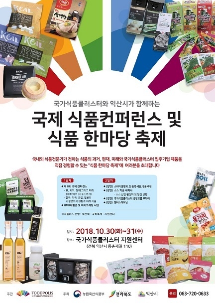 [푸드투데이 = 황인선기자] 국가식품클러스터지원센터(이사장 윤태진)는 오는 30일부터 31일까지 양일 간 '국가식품클러스터와 익산시가 함께하는 국제식품 컨퍼런스 및 식품한마당 축제'를 개최한다고 18일 밝혔다.국가식품클러스터 조성이 완료(‘17.12.31)됨에 따라 입주기업 및 분양기업과 함께하는 이벤트를 개최, 식품클러스터 멤버의 화합과 유대를 강화하는 계기를 마련했다.