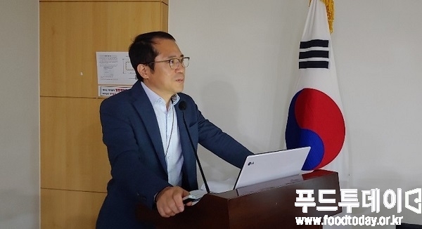 [푸드투데이 = 홍성욱 기자] 강대진 식품의약품안전처 건강기능식품정책과장이 19일 오전 서울 여의도 국회의원회관 제8간담회실에서 열린 제18차 'Food & meat communication' 포럼에서 '소비트랜드에 대응한 건강기능식품 정책' 주제로 강연을 하고 있다.