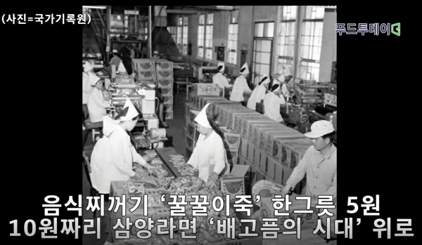 1945년 일어난 한국전쟁은 우리의 모든 것을 앗아갔죠. 미군이 버린 음식 찌꺼지를 끓인 꿀꿀이죽으로 주린 배를 달래야 했습니다. 전쟁이 끝나고 시간이 지났지만 극심한 식량난은 해결되지 않았죠. 식량난 해결이 시급하다고 느낀 삼양식품 전중윤 회장은 과거 일본에서 먹었던 라면을 떠올립니다. 값도 저렴하고 조리 방법도 간단해 대체식품으로 손색이 없었죠. 정부 지원을 받아 일본 묘조식품에 애원을 해 들어온 라면 제조기기 2대와 기술은 1963년 우리나라 최초의 라면을 탄생시킵니다. 꿀꿀이죽 한그릇에 5원이었던 시절. 10원짜리 삼양라면은 배고픈 국민들의 배를 든든하게 채워줬습니다.