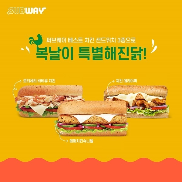 [푸드투데이 = 조성윤기자] 써브웨이는 무더위가 절정을 이루는 말복 시즌을 앞두고 MZ세대를 겨냥한 특별한 여름철 보양식으로 ‘베스트 치킨 샌드위치 3종’을 소개했다.
