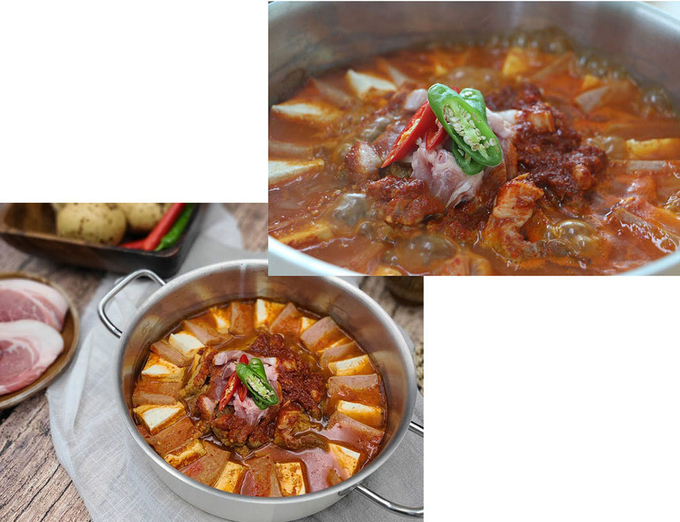 흑돼지, 양념소스, 프레스햄, 표고버섯, 대파, 양파, 감자, 청.홍고추, 김치, 두부