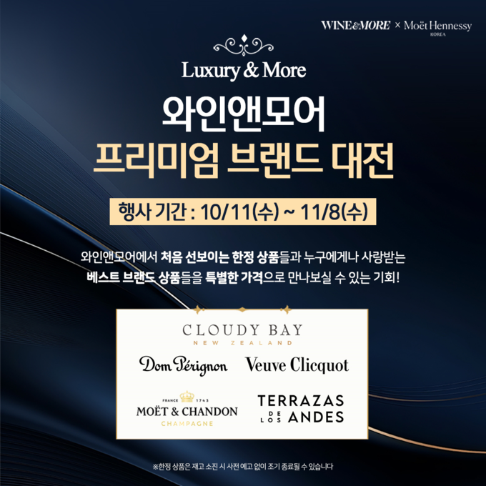 [푸드투데이 = 조성윤기자] 신세계L&B가 11월 8일까지 전국 와인앤모어 46개 매장에서 모엣 헤네시와 협업해 ‘럭셔리 앤 모어(Luxury & More)’ 프로모션을 진행한다.