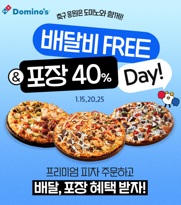 도미노피자는 대한민국을 응원하는 고객들을 위해 '배달비 Free & 포장 40% Day' 프로모션을 예선 경기가 열리는 15일, 20일, 25일 3일간 진행한다.