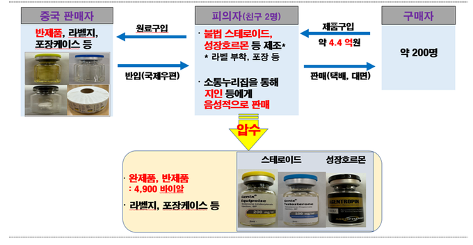 이들은 2017년 4월부터 2023년 10월까지 중국 판매자로부터 스테로이드, 성장호르몬 등 의약품 성분이 담긴 바이알 상태의 반제품을 국제우편으로 받아 제품명 등이 인쇄된 라벨을 부착하는 방식으로 총 23종의 불법 의약품을 제조했다.