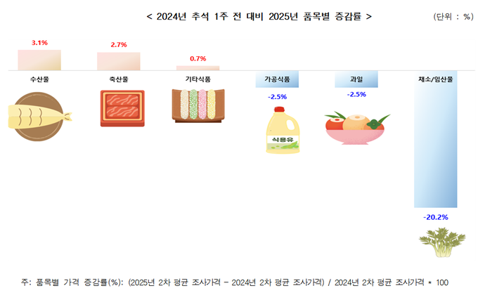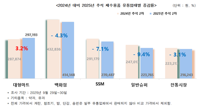 유통업태별 전년 대비 비교에서는 백화점(-0.7%), 전통시장(-5.5%), SSM(-5.8%), 일반슈퍼마켓(-9.4%)은 모두 하락했지만 대형마트만 3.2% 상승했다. 대형마트에서 과일류는 19.0%, 축산물은 10.7%나 올라 전체 평균을 끌어올렸다. 반대로 일반슈퍼마켓에서는 시금치(-64.6%), 대추(-33.6%), 두부(-21.5%) 등 주요 품목이 크게 떨어졌다.