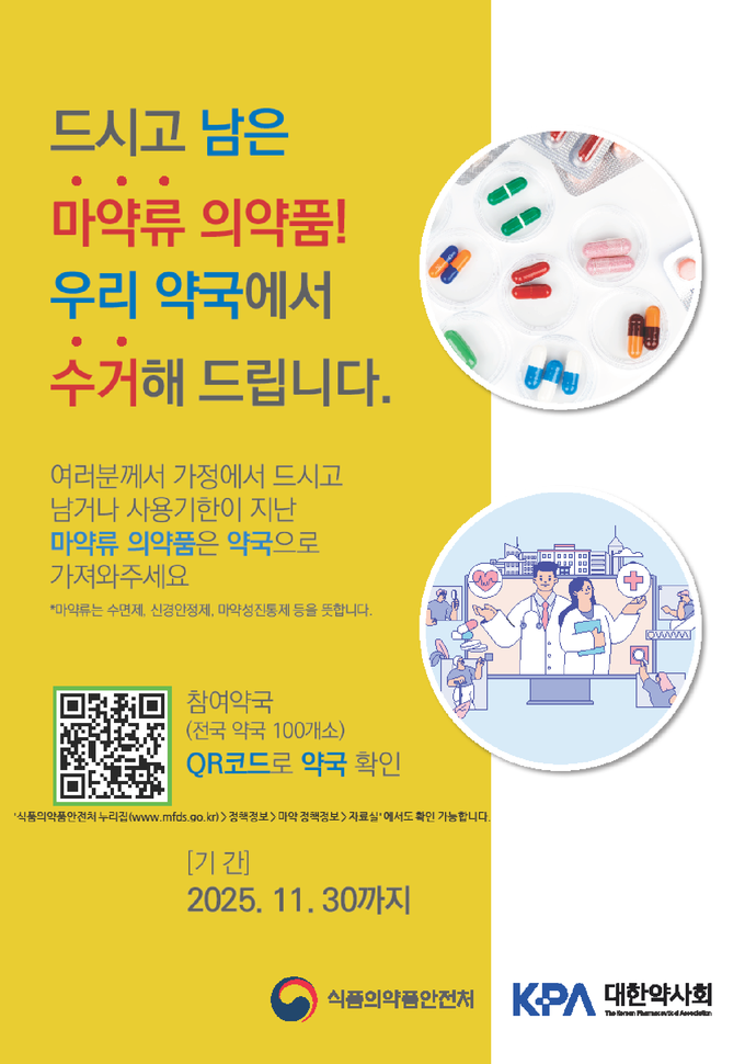 또한, 마약류는 오남용 시 중독, 심각한 부작용, 사망 등을 초래할 수 있으므로 추석을 맞아 방문한 부모님댁 등 가정에서 사용(복용)하고 남은 마약류 의약품을 약국, 종합병원 내 약국에 반납하는 것이 좋다. 올해 수거‧폐기 사업에 참여하는 약국 목록은 ‘식품의약품안전처 누리집(www.mfds.go.kr) → 정책정보 → 마약 정책정보 → 자료실’에서 확인 가능하다.