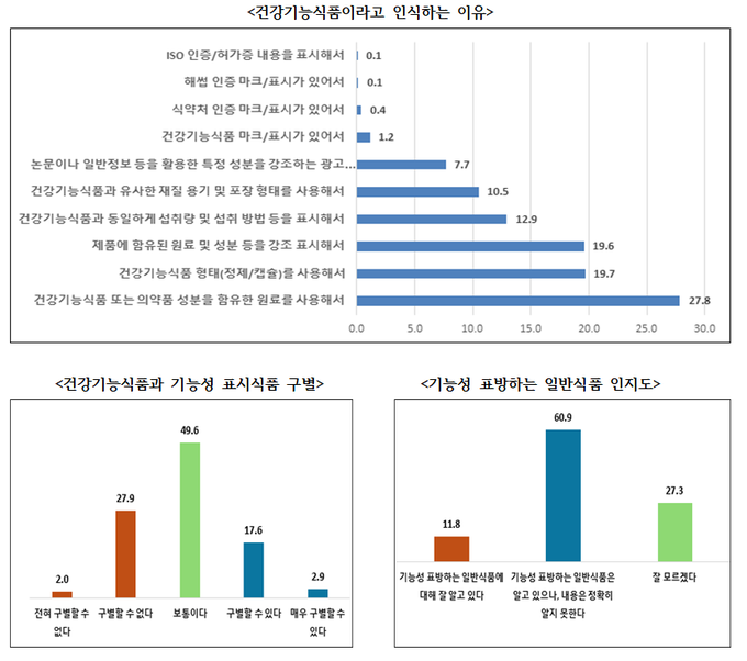 조사 결과, 크릴오일·보스웰리아·콘드로이친 등이 함유된 일반식품을 절반 이상 소비자(50% 이상)가 건강기능식품으로 오인하고 있었다. 건강기능식품이라고 착각한 이유로는 ▲건강기능식품 또는 의약품 성분 함유(27.8%) ▲정제·캡슐 형태(19.7%) ▲원료·성분 강조 표시(19.6%) 순으로 나타났다.