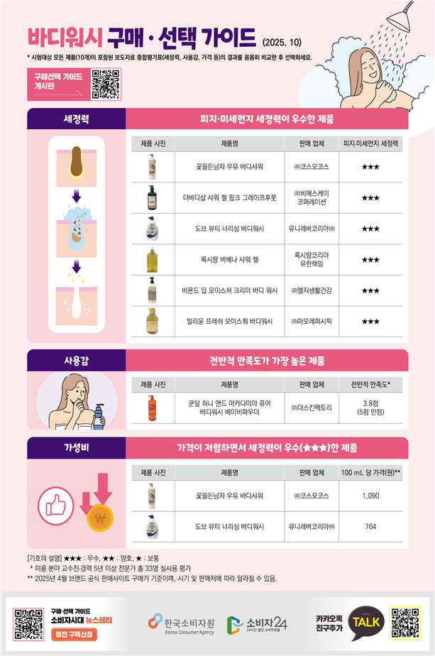 한국소비자원은 “화장품(바디워시) 관련 품질·안전성·환경성 정보를 지속 제공해 합리적 선택을 돕겠다”고 밝혔다. 소비생활 불만·피해 상담은 1372소비자상담센터(국번없이 1372)에서 가능하다.