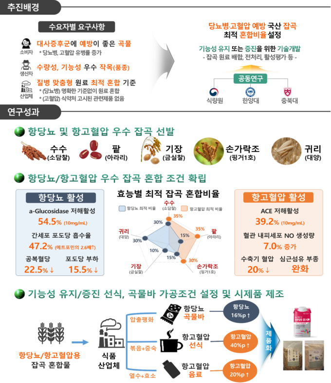 잡곡은 식이섬유, 폴리페놀, 단백질 등 풍부한 영양성분을 함유하고 있어 기능성 소재로서 가치가 높지만 지금까지 시판된 잡곡 혼합 제품은 주로 맛과 식감 위주의 배합에 그쳐 과학적 근거가 부족하다는 한계가 있었다.