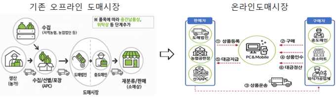 6일 농식품부에 따르면 기존에는 농산물이 산지에서 도매시장 거래를 거쳐 소비지로 이동하는 다단계 유통구조였지만 온라인도매시장을 활용하면 거래 상품이 산지에서 소비지로 바로 배송되어 도매시장 반입, 상하차, 재포장 등 중간 물류 과정이 생략되며, 운송·포장 등 부대비용이 줄고, 상품 신선도와 가격 투명성은 높아진다.