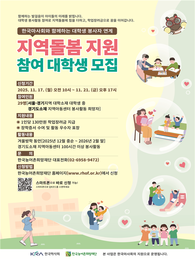 한편 희망재단은 이번 복지사업을 통해 대학생들이 방학 기간 중 돌봄 활동에 직접 참여하며 진로탐색의 기회는 물론, 참여 학생으로서의 공공적 역할을 수행할 수 있도록 적극 지원할 계획이다. 또한 활동성과가 우수한 학생에게는 별도 포상(한국마사회장상 2명, 한국농어촌희망재단 이사장상 3명)도 수여될 예정이다.