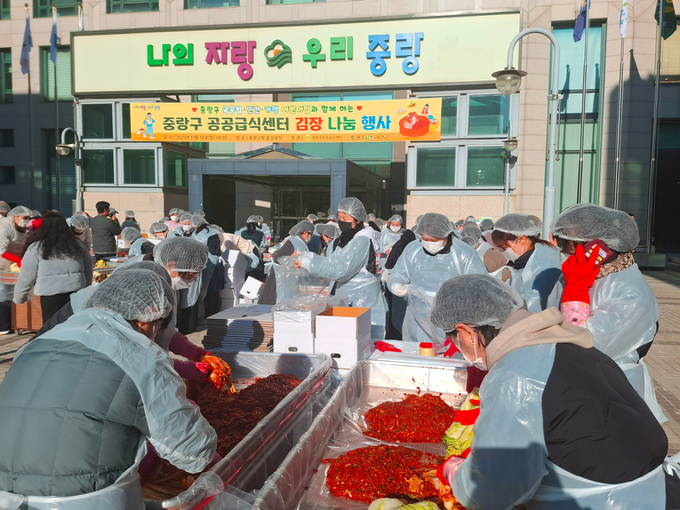 이번 행사는 군먹거리통합지원센터, 서울 중랑구 공공급식센터, 중랑구어린이집연합회 소속 원장 등 100여 명이 참여한 가운데, 도시와 농촌 간의 먹거리 연대 및 상호 교류를 강화하고 건강한 지역 먹거리 순환체계 실현을 위해 이른 아침부터 진행됐으며, 참가자들은 괴산에서 생산된 신선한 지역 농산물을 활용해 김장김치를 함께 담갔으며, 완성된 김치(10kg 100박스)는 중랑구 내 어린이 취약계층에게 전달된다.