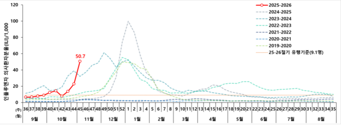 질병청에서 운영 중인 의원급 의료기관의 인플루엔자 의사환자(ILI) 표본감시 결과, 지난 2일부터 8일까지 인플루엔자 의사환자 분율은 외래환자 1,000명당 50.7명으로 10월 26일부터 11월 1일 22.8명 대비 2배 이상 증가했고, 최근 10년 같은기간 대비 최고 수준의 발생이며, 유행 확산으로부터 고위험군을 보호하기 위해 예방접종 지속 독려 및 치료제 수급 현황 점검 등 대비, 대응이 요구되는 상황이라고 질병청은 설명했다.