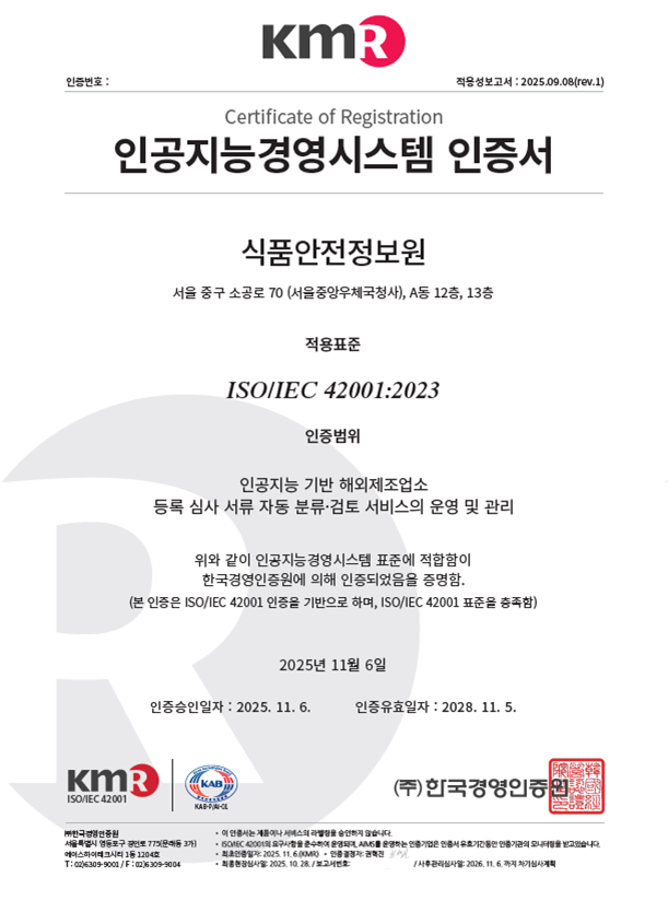 [푸드투데이 = 황인선기자] 식품안전정보원(원장 이재용)은 해외제조업소 등록 심사 업무에 적용 중인 ‘인공지능 기반 해외제조업소 등록 심사 서류 자동검토 시스템’에 대해 공공기관 최초로 인공지능경영시스템(ISO/IEC 42001) 인증을 취득했다고 18일 밝혔다.