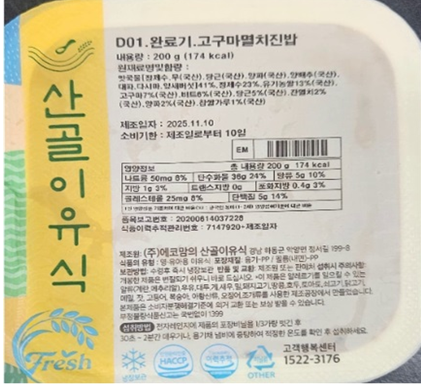 [푸드투데이 = 황인선기자] 식품의약품안전처(처장 오유경)는 경남 하동군에 소재한 식품제조·가공업체 에코맘의 산골이유식이 제조·판매한 ‘고구마멸치진밥(영·유아용 이유식)’에서 세균수가 기준치를 초과해 부적합 판정을 받음에 따라 제품 판매 중단 및 회수 조치에 들어갔다고 19일 밝혔다.