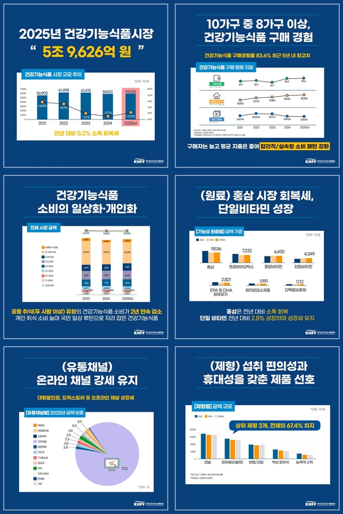 한국건강기능식품협회(회장 정명수, 이하 건기식협회)는 2025년 국내 건강기능식품 시장 규모가 5조 9,626억 원으로, 전년 대비 소폭 회복세(0.2%)를 보였다고 20일 밝혔다.